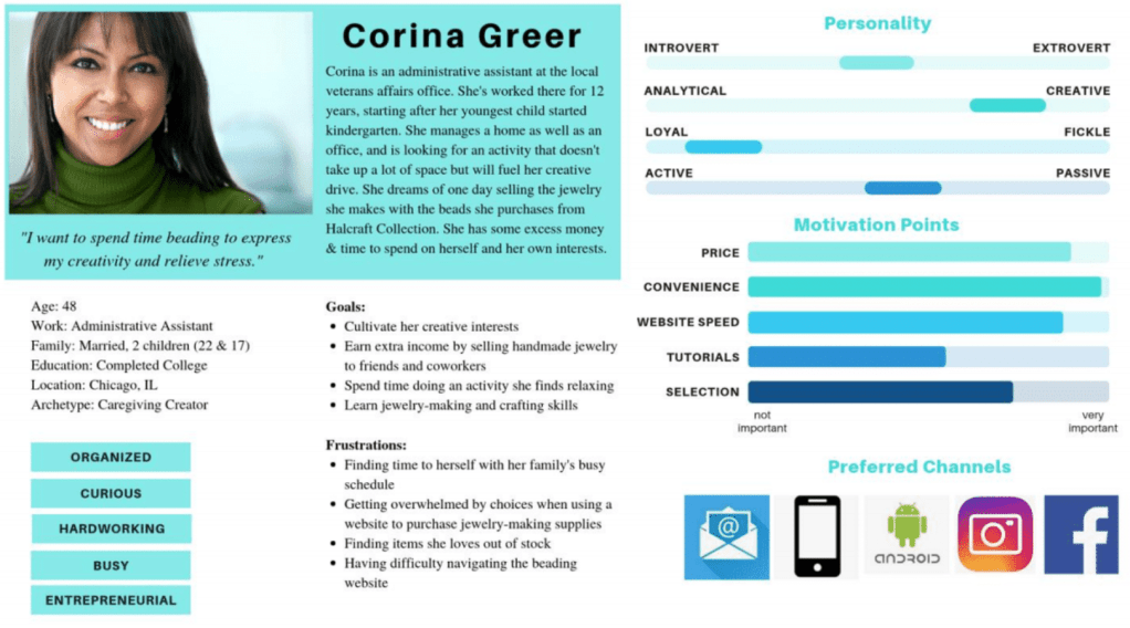 Molly recruited 94 participants via social media completed a questionnaire created in SurveyMonkey to collect ethnographic information about beaders. From the data collected in that survey she created user personas. Survey participants, from novices to experts, participated in user testing to create a Task Analysis diagram. Users were recorded them remotely via Zoom as they progressed through the tasks, describing their choices in a cognitive walk through the website. This helped identify “pain points” and moments of delight or mastry during specific tasks. Time to navigate through the task, number of clicks, frustration points, and moments of flow were used to evaluate the process.